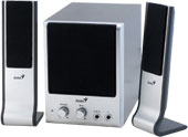 Nét duyên dáng của bộ loa 2.1 này nằm ở 2 loa trái/phải: khá mỏng (65mm) và đường nét, toát lên vẻ thanh lịch khi đặt trên bàn làm việc. Loa vệ tinh gồm 1 loa con 1,5, tải âm trung và cao trong khoảng tần số 80Hz - 20kHz, màng chắn loa bằng vải. Loa sub thiết kế đơn giản, chỉ có nút chỉnh âm bass và âm lượng, phía trước loa sub có ngõ line-in và ngõ cắm cho tai nghe (hơi bất tiện nếu bạn dùng tai nghe vì loa sub đặt dưới đất). Loa sub kích thước 4, tải âm trầm từ 20Hz - 220Hz, lỗ thông gió phía sau thùng sub.