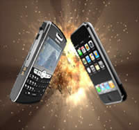 Apple thồi luồng gió mới trên thị trường điện thoại với “quả bom tấn” iPhone. Chính iPhone đã làm khuynh đảo thị trường smartphone với giao diện tuyệt đẹp cùng những tính năng multimedia ấn tượng. RIM chứng tỏ là “anh cả” trên “mặt trận” này. Các kỹ sư hàng đầu của công ty đã cật lực ngày đêm để ứng dụng những công nghệ mới nhất cho phiên bản điện thoại mới nhất, BlackBerry 9000, để tấn công iPhone.