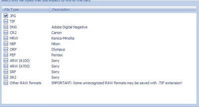 - Tại bước tiếp theo, chương trình sẽ yêu cầu bạn xác nhận các định dạng ảnh mà bạn muốn chương trình sẽ khôi phục từ thẻ nhớ. Tại đây còn có các định dạng ảnh đặc trừng và riêng của các nhãn hiệu máy ảnh khác nhau như Canon, Sony, Olympus…Sau khi chọn xong các định dạng ảnh cần thiết, bạn click Next để sang bước tiếp theo.