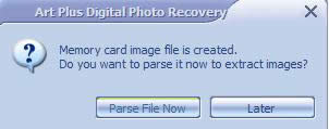 - Sau khi quá trình kết thúc, bạn click vào Finish, 1 hộp thoại hiện ra hỏi bạn có sử dụng ngay file Image vừa được tạo ra hay không? Nếu bạn muốn sử dụng ngay file image của thẻ nhớ vừa được tạo ra để khôi phục lại hình ảnh từ thẻ nhớ thì bạn click vào Parse File Now Sau khi bạn click vào Parse Now, các bước tiến hành khôi phục sẽ được thực hiện như khi bạn tiến hành khôi phục ảnh bị xóa nhầm hoặc format nhầm từ thẻ nhớ hoạt động bình thường.