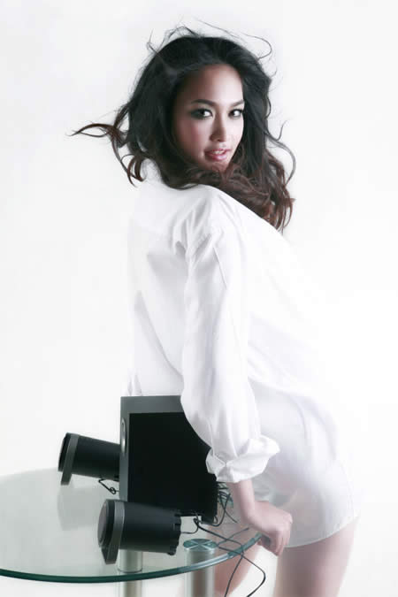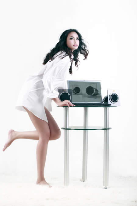Những bộ loa 2.0 và 2.1 của Altec Lansing dành cho các hệ thống để bàn và laptop nổi bật bên người mẫu tuổi teen.